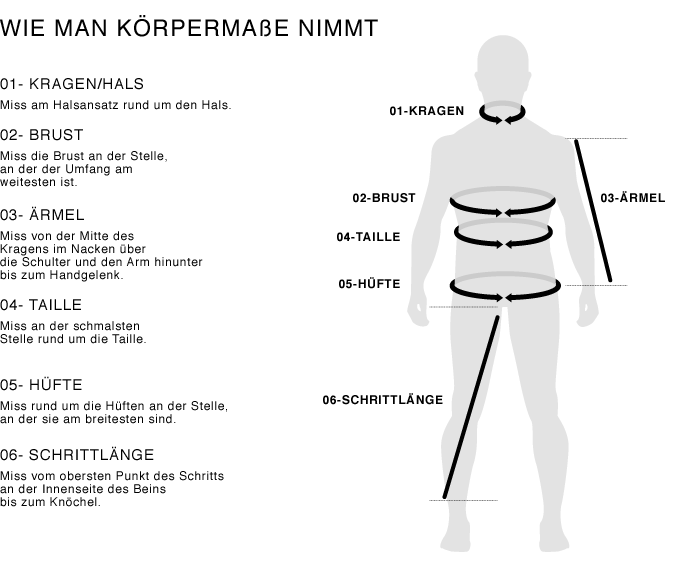 | GRÖßE | HÖHE (cm) | BRUST (cm) | ÄRMEL (cm) | TAILLE (cm) | HÜFTE (cm) | SCHRITTLÄNGE (cm - from inseam to ankle) |
